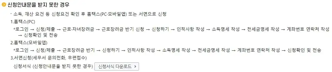 - 안내문을 받지 못하 신경 우는 직접입력 신청을 통해서 소득명세, 전세금명세 작성을 하고, 개인정보를 입력하시면 신청이 완료됩니니다