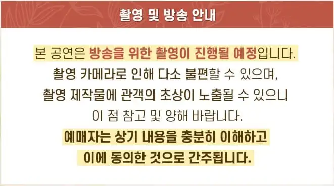 - 공연 중 모든 형태의 사진 및 동영상 촬영은 금지되니 꼭 지켜주시기 바랍니다.