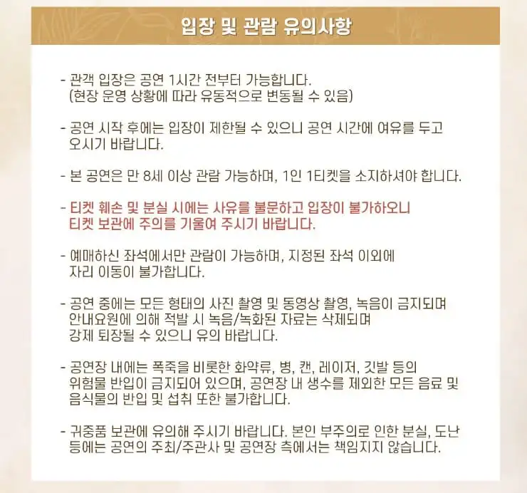 - 티켓 훼손 및 분실 시 입장이 불가능하오니 주의를 기울여 주시기 바랍니다.